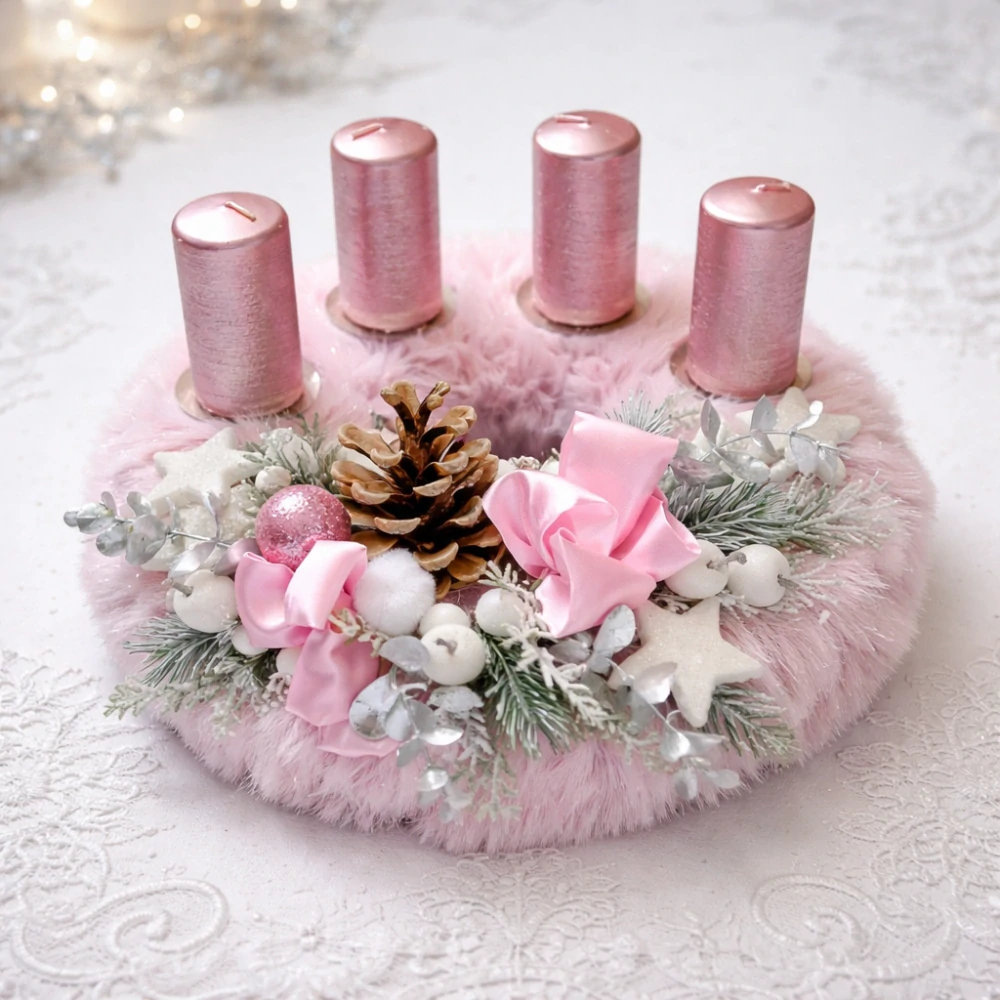 Romantický adventní svícen v růžové barvě je ručně vyráběná vánoční dekorace, která zaujme na první pohled svým jemným, elegantním a netradičním provedením. Tento kulatý adventní věnec se čtyřmi svíčkami je zasazen do hebkého chlupatého základu v pudrově růžovém odstínu, který působí měkce, hřejivě a luxusně.