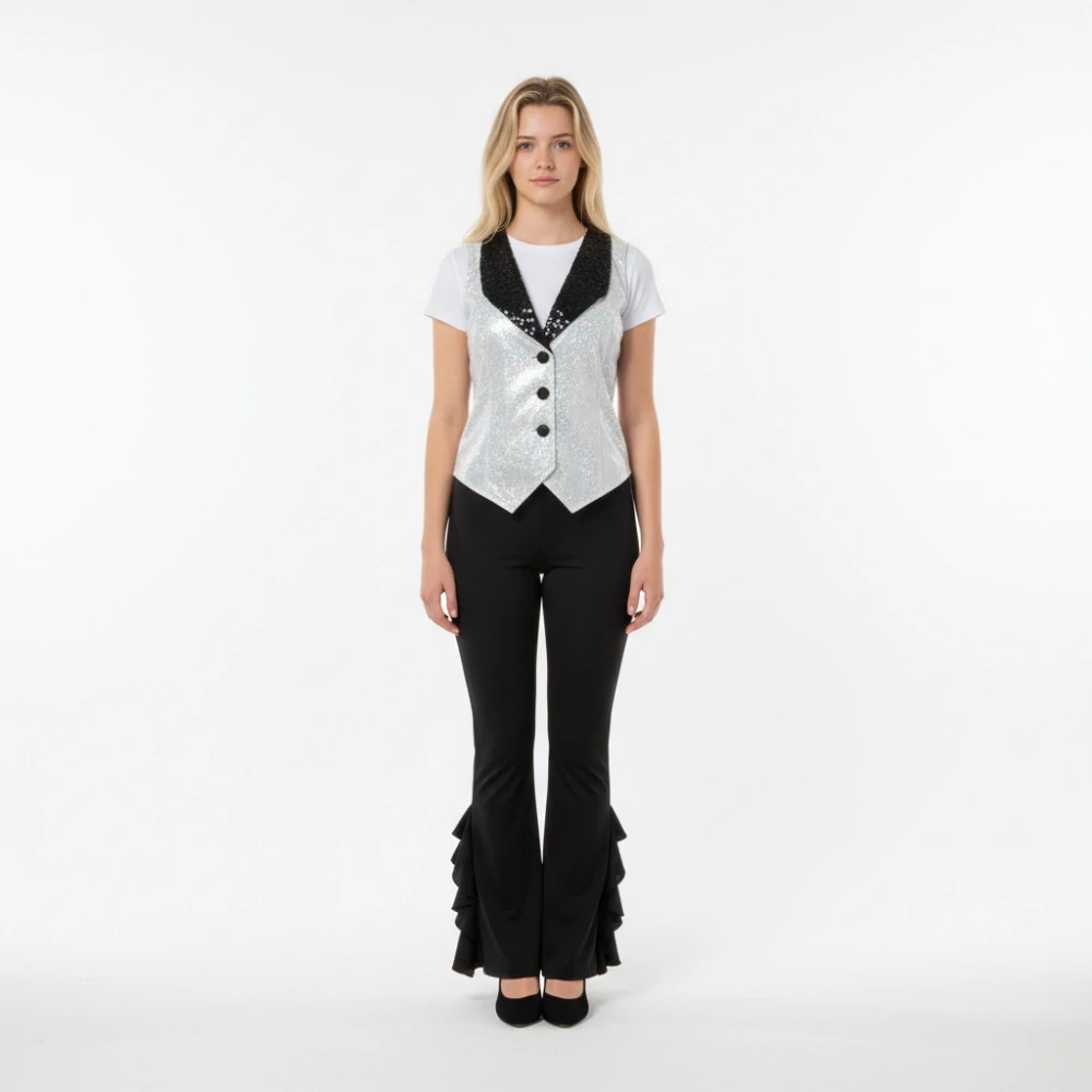 Dámský kostým disco v retro stylu je skvělou volbou pro všechny milovnice 70. let a tanečních večírků. Outfit tvoří výrazná třpytivá stříbrná vesta s černými detaily a stylové kalhoty s rozšířenými nohavicemi.