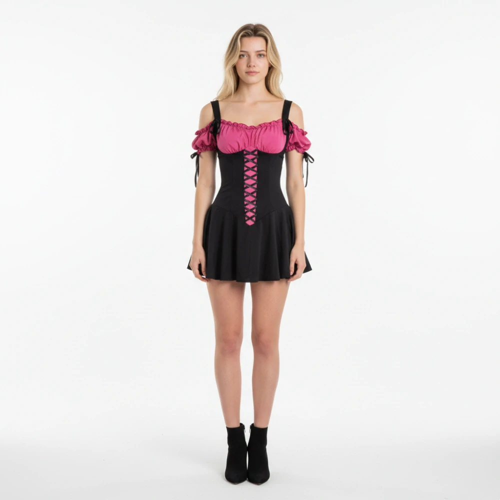 Tento dámský maškarní kostým s korzetovým efektem je navržen tak, aby zvýraznil ženskou siluetu a působil elegantně i smyslně. Kombinace černé sukně a růžového živůtku se šněrováním vytváří výrazný kontrast, který okamžitě upoutá pozornost.