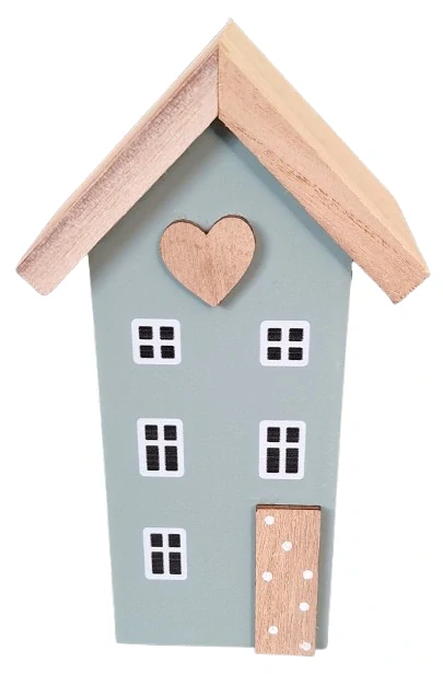 Stylový dřevěný dekorační domeček se srdíčkem je minimalistická bytová dekorace, která vnese do interiéru útulnou atmosféru domova. Jemný šalvějový odstín v kombinaci s přírodní střechou a dřevěnými detaily působí harmonicky a nadčasově.