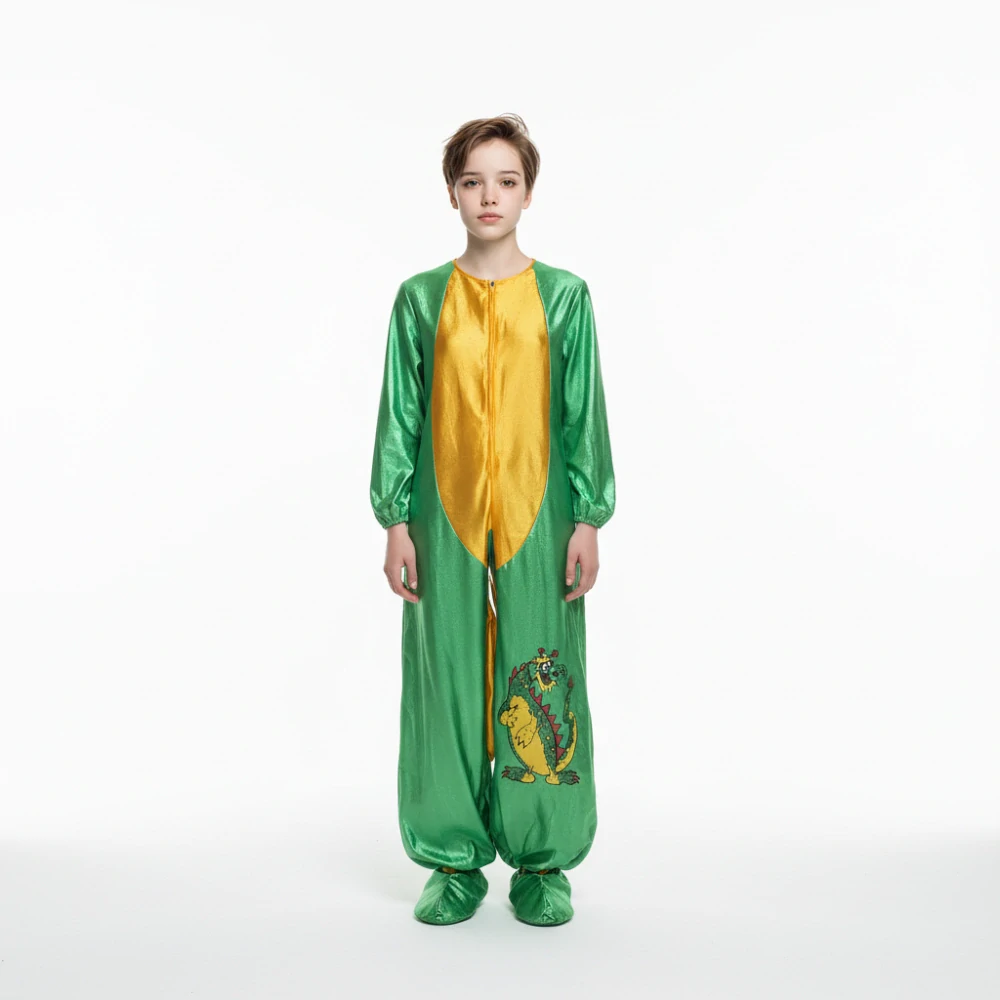 Na nohavici je umístěn roztomilý obrázek dinosaura, který dodává kostýmu hravý vzhled. Díky jednoduchému střihu je převlek vhodný na karneval, maškarní ples, Halloween, školní akce nebo dětské oslavy.