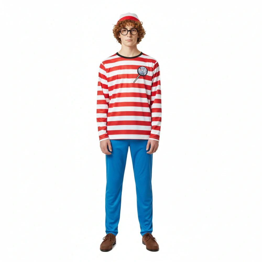 Karnevalový kostým inspirovaný známou postavou „Hledá se Wally“ je skvělou volbou pro tematické večírky, karnevaly nebo skupinové kostýmy. Typické červeno-bílé pruhované tričko doplňují modré kalhoty a čepice, díky kterým je outfit okamžitě rozpoznatelný.