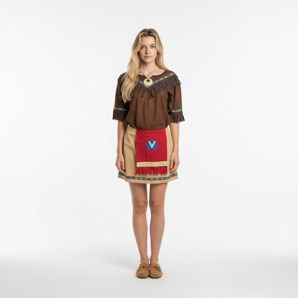 Tento dámský maškarní kostým indiánky inspirovaný postavou Pocahontas zaujme na první pohled propracovanými detaily a přírodní barevností. Kostým se skládá z hnědého topu s třásněmi a etnickým vzorem, sukně v přírodních tónech s ozdobnou zástěrkou a indiánských dekorativních prvků, které dotvářejí autentický vzhled.