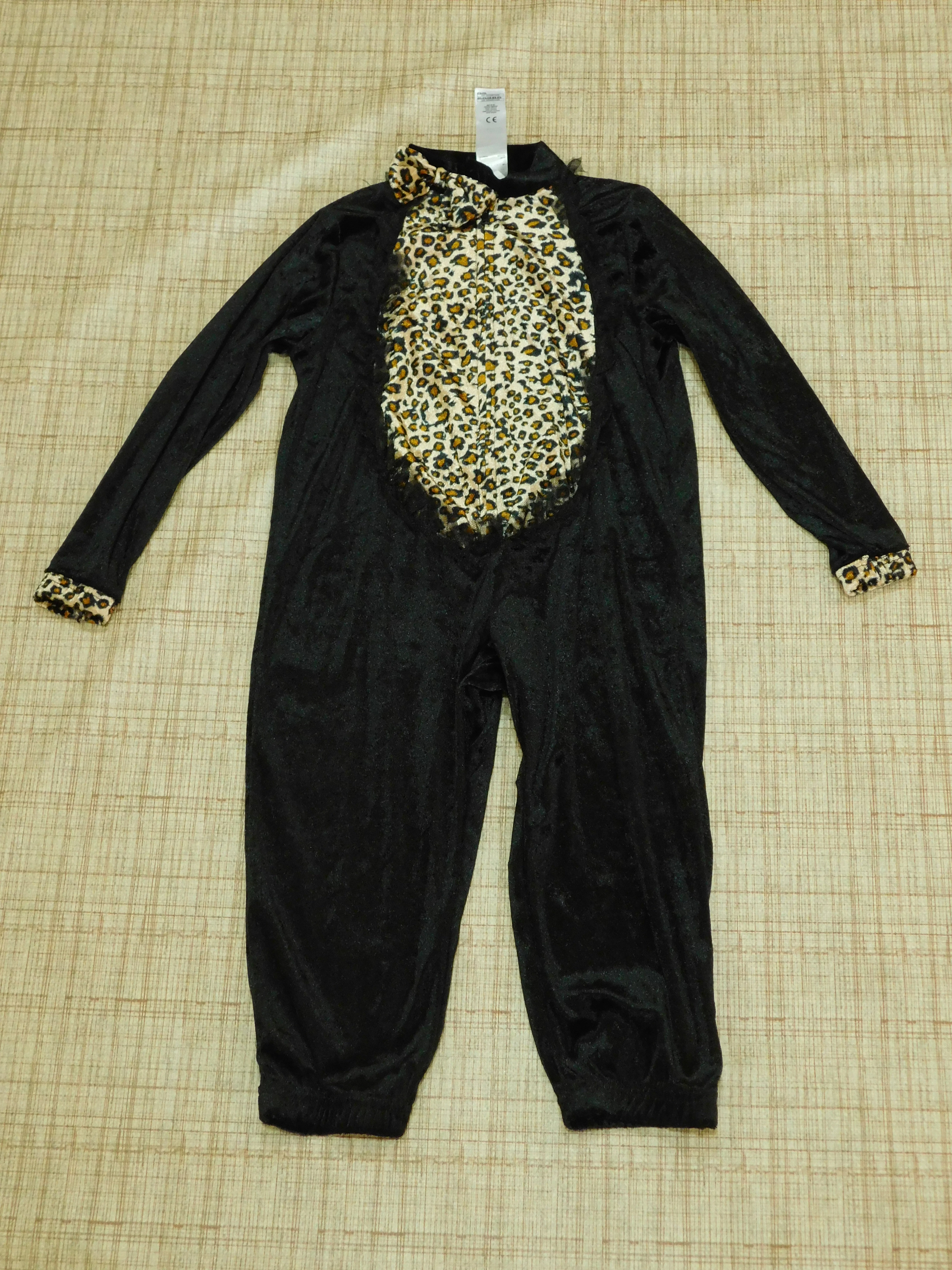 Roztomilý dětský kostým kočky v černé barvě s leopardím vzorem na hrudi a manžetách. Součástí overalu je i chlupatý ocásek, který dodává kostýmu autentický zvířecí vzhled. Kostým je měkký, pohodlný a snadno se obléká – ideální pro menší děti.