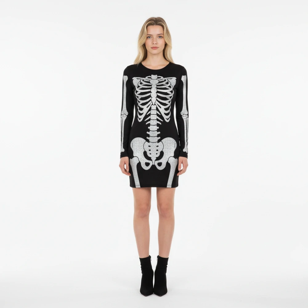Tento kostým kostra – skeleton šaty se skvěle hodí na Halloween party, karneval, tematickou oslavu, klubovou akci nebo kostýmové focení. Lze jej jednoduše doplnit o punčochy, boty na podpatku, výrazný make-up nebo doplňky, čímž vznikne opravdu působivý outfit.