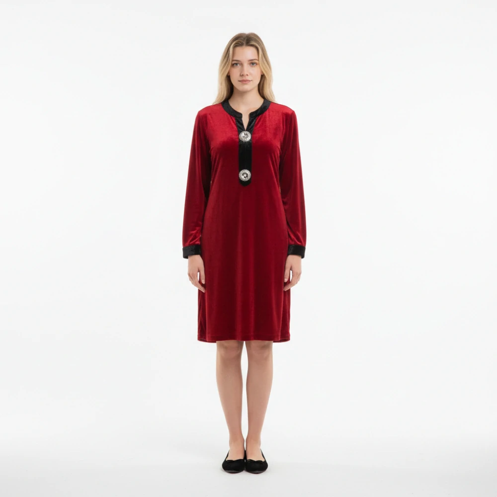 Luxusně působící dámské sametové šaty v tmavě červeném vínovém odstínu zaujmou na první pohled svým elegantním a lehce orientálním vzhledem. Jemně lesklý sametový materiál dodává šatům slavnostní charakter, zatímco černé kontrastní lemy na rukávech, výstřihu a spodním okraji podtrhují jejich výrazný styl.