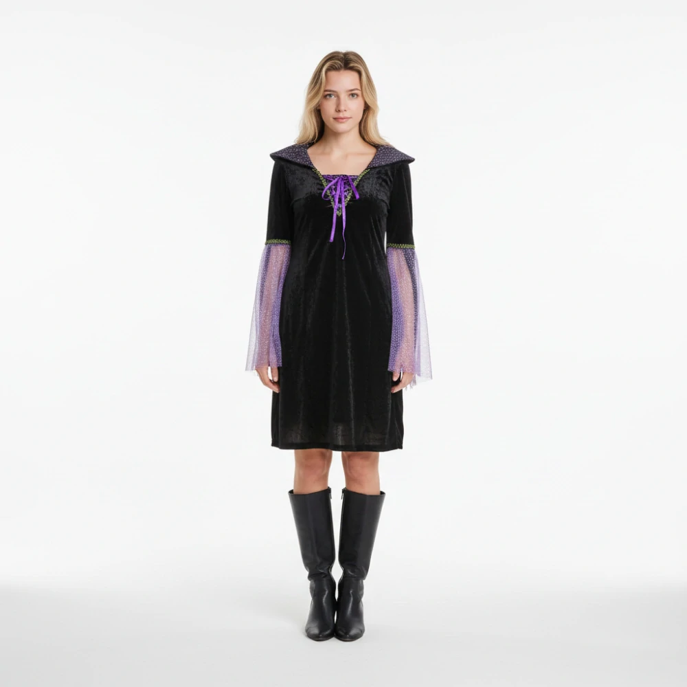 Dominantou kostýmu je výrazný límec a šněrování na hrudi s fialovou stuhou, které dodává celému outfitu autentický vzhled čarodějky nebo gotické postavy. Rukávy jsou doplněny jemnou průsvitnou krajkou ve fialovém tónu, což působí velmi elegantně a ženským dojmem.