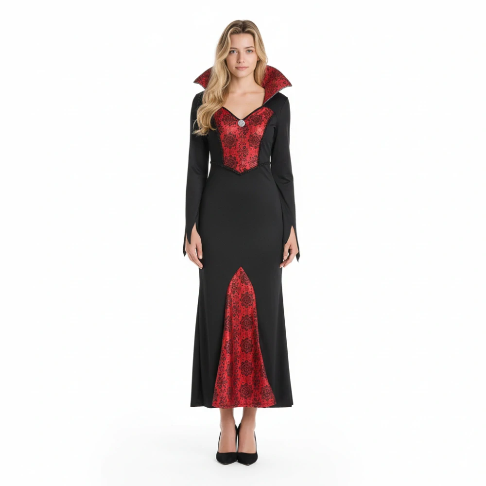 Luxusní a výrazný dámský maškarní kostým upírky (vampírky) v kombinaci černé a sytě červené barvy je ideální volbou pro všechny milovnice temné elegance. Tento Halloween kostým zaujme na první pohled svým propracovaným korzetovým živůtkem, výrazným stojáčkem a dlouhou splývavou sukní.