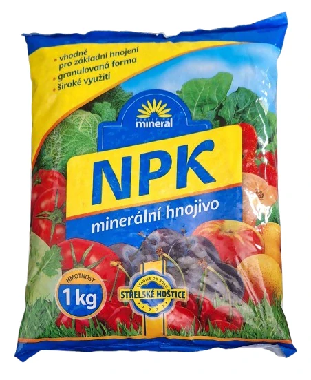 Minerální hnojivo NPK Střelské Hoštice 1 kg je osvědčené zahradní hnojivo určené pro základní i průběžné hnojení během vegetace. Obsahuje vyvážený poměr dusíku (N), fosforu (P) a draslíku (K), který zajišťuje správný vývoj rostlin od zakořenění až po tvorbu plodů.