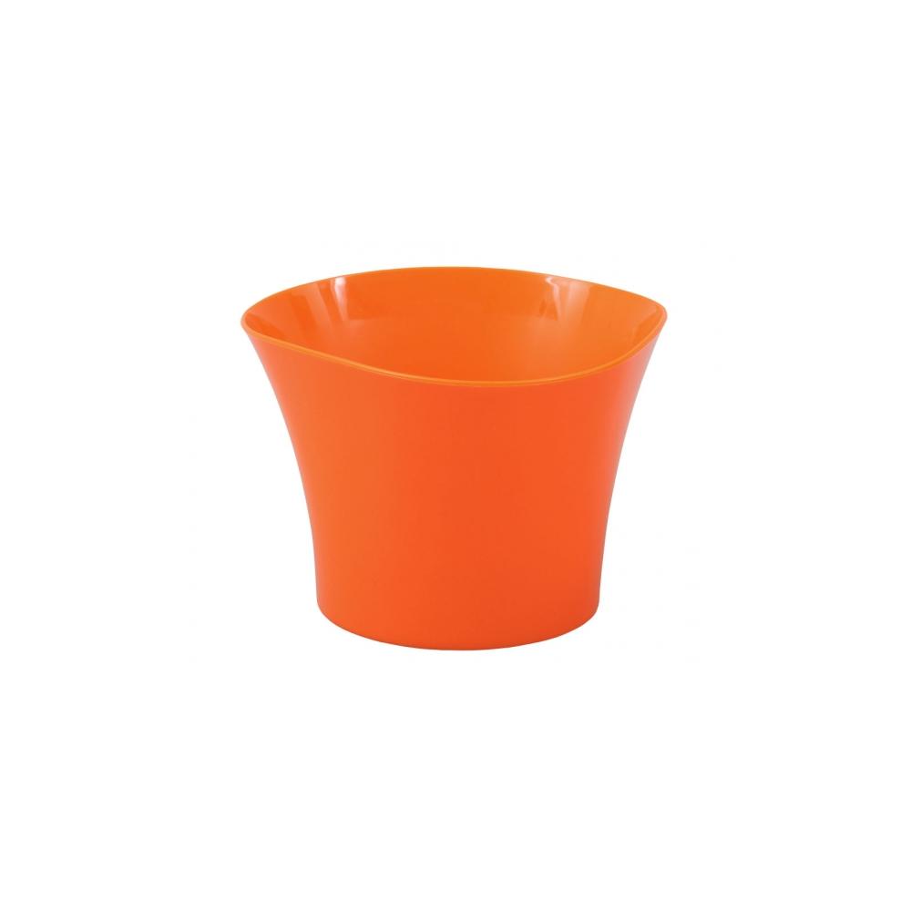 Plastový oranžový lesklý obal určený zejména do interiérů pro květníky s petrklíči. Půdorys má kruhový, směrem vzhůru se stává trojúhelníkový se zaoblenými zvlněnými hranami. Rozměry: d. 12 x v. 9cm.