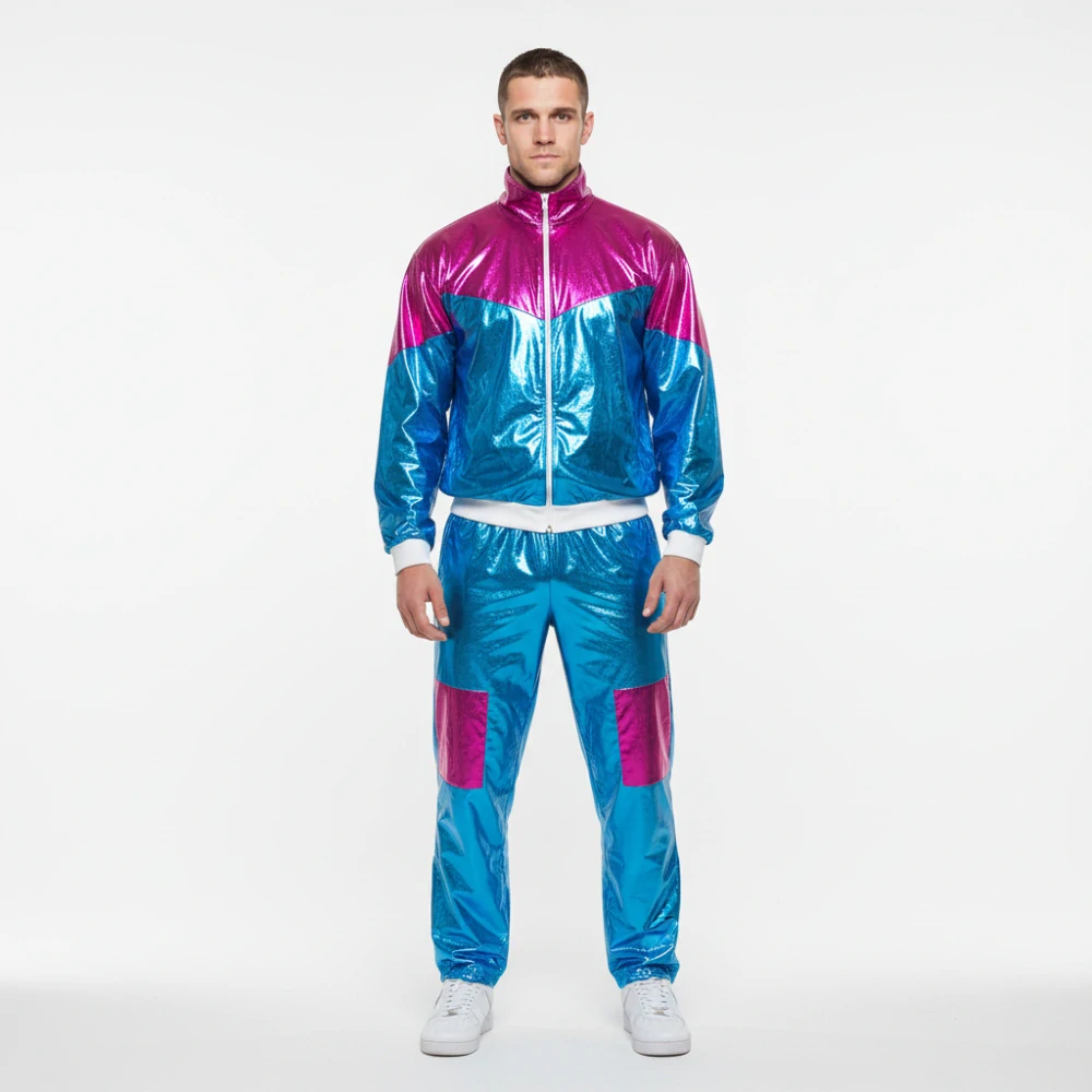 Pánský maškarní kostým ve stylu 80. let je nepřehlédnutelný outfit inspirovaný retro módou. Kombinace výrazné růžové a modré barvy s lesklým efektem vytváří typický disco styl, který okamžitě upoutá pozornost.