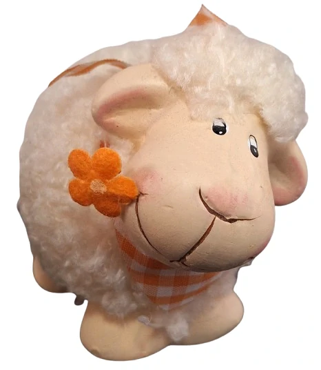 Roztomilá ovečka s oranžovou kytičkou a šátkem je hravou dekorací, která rozzáří každý interiér. Měkký vzhled „vlny“ v kombinaci s jemnými detaily působí velmi přívětivě a vesele.