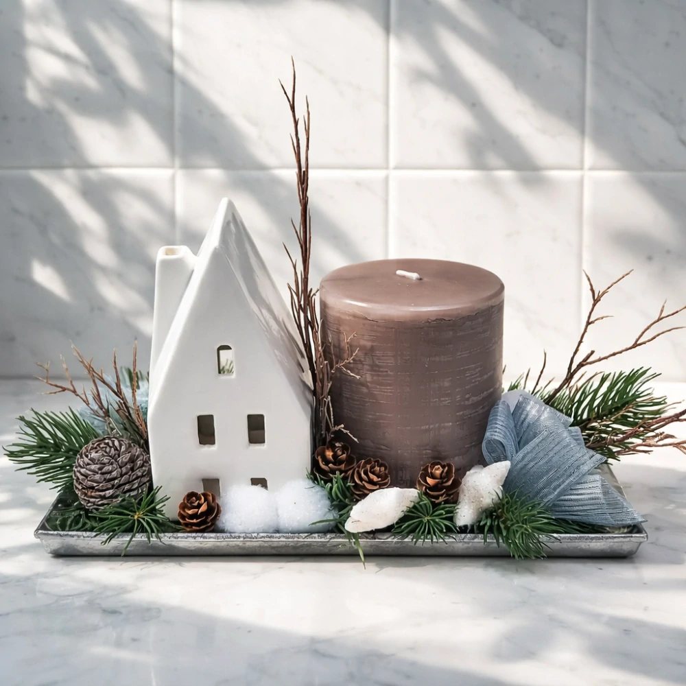 Tento vánoční svícen s domečkem je ručně aranžovaná zimní dekorace inspirovaná skandinávským stylem. Základ tvoří podlouhlá podložka s přírodním chvojím, šiškami a jemným zimním efektem. Dominantním prvkem je bílý keramický domeček v kombinaci se svíčkou v šedém odstínu, která vytváří klidnou a hřejivou atmosféru.
