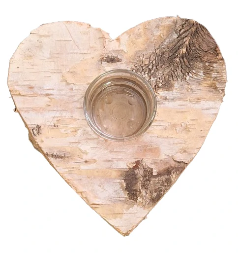 Srdíčko vyrobené z březové kůry se skleněnou miskou na svíčku.