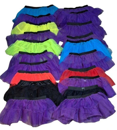 Sada 20 kusů tylových sukýnek, vhodné pro mateřské školky, tábory, nebo kulturní spolky. Různé velikosti obvod pasu od 25-35 cm, barvy na foto, délka cca 20-25 cm