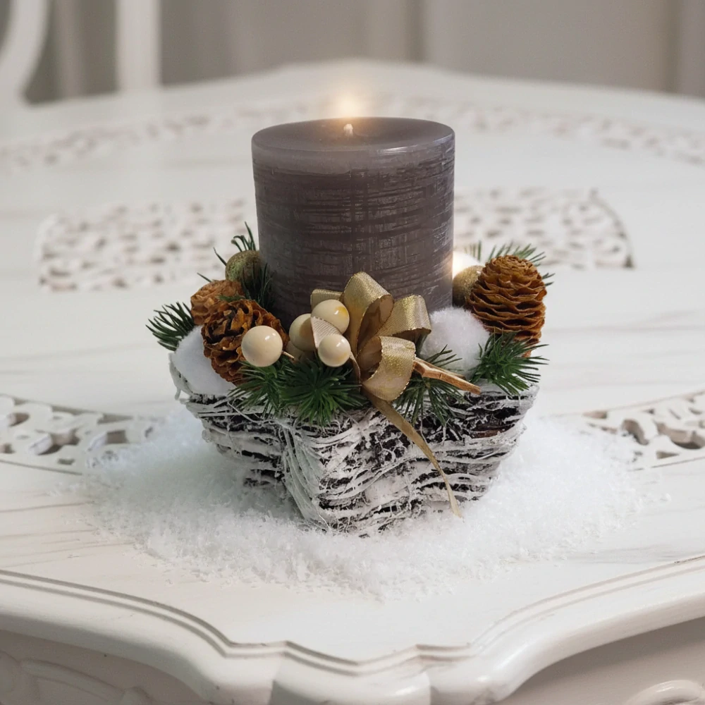 Tento vánoční svícen se šedou svíčkou zaujme originálním hvězdicovým základem, který dodává celé dekoraci výjimečný vzhled. Dominantou je masivní šedá svíčka s rustikální strukturou, laděná do elegantního a klidného zimního stylu.