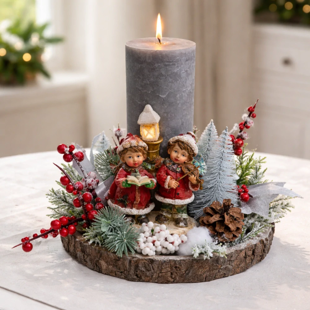 Tato ručně vyráběná vánoční dekorace se svíčkou a koledníky je laděna do elegantního a zimního vánočního stylu. Dominantním prvkem je šedá válcová svíčka, která dodává aranžmá modernější a klidný vzhled. Atmosféru tradičních Vánoc dotvářejí dvě figurky koledníků s lucernou, symbolizující vánoční pohodu a staročeské koledování.