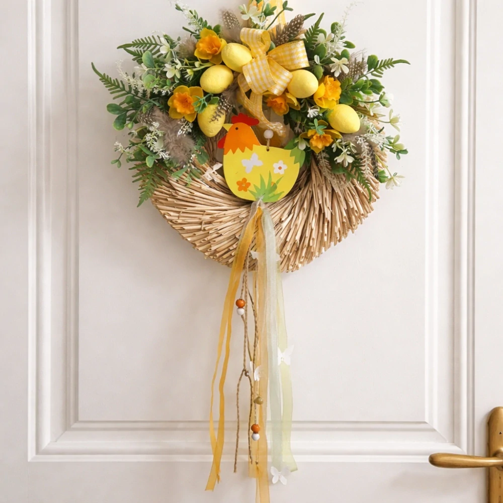 Originální ručně aranžovaný velikonoční věnec na dveře je vytvořen na přírodním slámovém základu a zdobený bohatou kombinací zeleně, narcisů, dekorativních vajíček, peříček a žluté kostkované mašle. Dominantou věnce je dřevěná slepička, která podtrhuje velikonoční charakter dekorace.